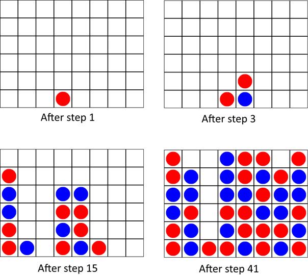 In order to illustrate the way the MCTS algorithm works, let us consider a game between two MCTS-based machine players in a well-known game of Connect-4. In each step, each of the players was allotted 7 second for a move. Four interesting steps were selected from the played game. The following figure shows snapshots of the game board taken in these four steps (after the move was performed). The statistics computed for each available action (move) just prior to the presented game positions are provided below in the text. Please note that Q and N denote the parameters from the UCT formula. The boundary values of Q are equal to 0 (expected loss for red) and 100 (expected victory for red), respectively.